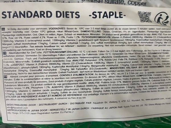 Hikari Staple is het perfecte basisvoer voor koi en vijvervissen. Ideaal om dagelijks te voeren. De drijvende korrels vervuilen het water niet. Hikari Staple is makkelijk verteerbaar, zorgt voor een constante groei en voor gezonde vissen. Het hoge gehalte aan groenvoer draagt bij tot een optimale gezondheid van de koi. Verkrijgbaar in mini, medium en large pellets in allerlei maten verpakkingen. Hikari Staple mag gevoerd worden vanaf 12°C.