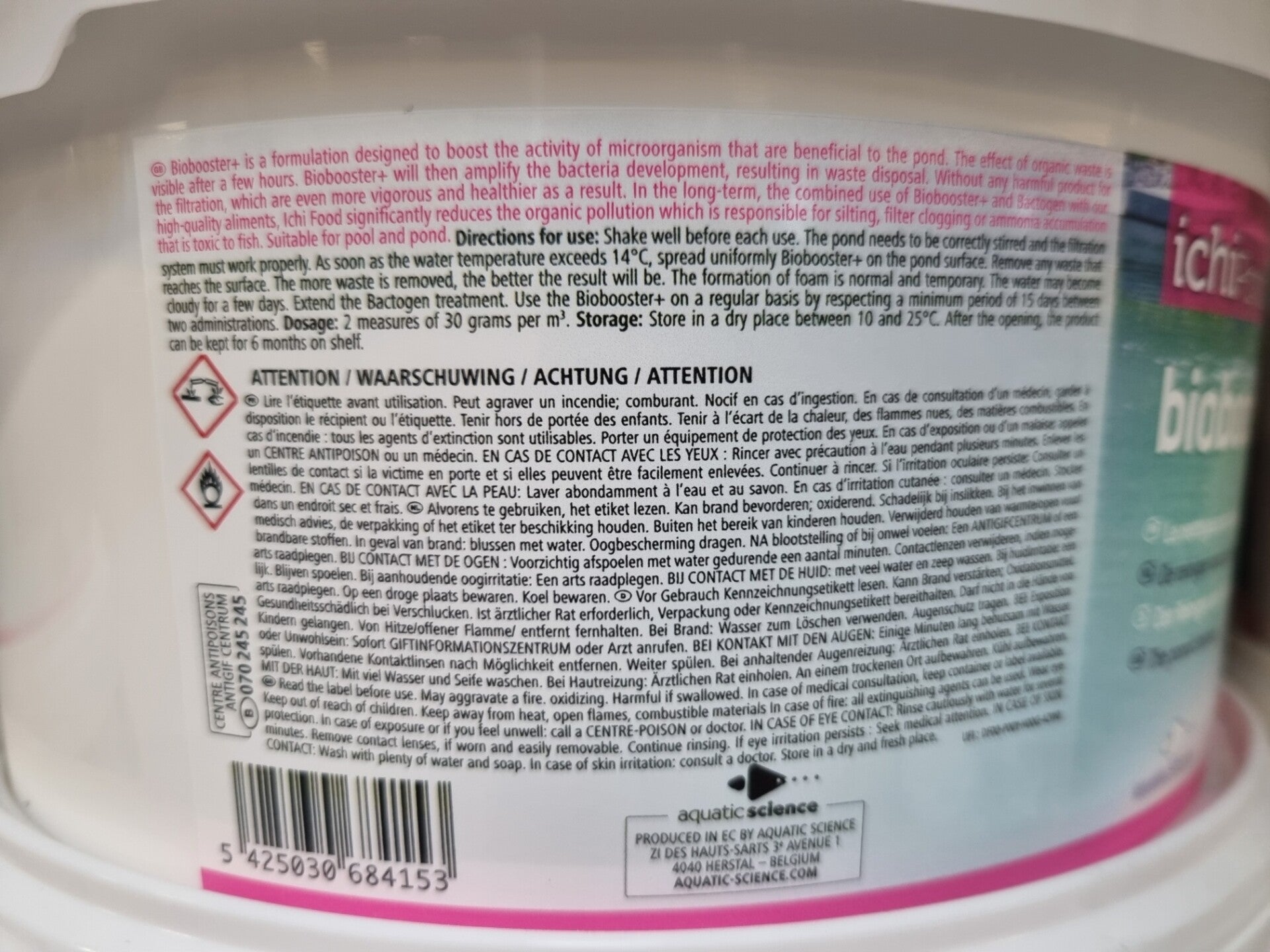 Biobooster+® is een geconcentreerde formule die een "boost" (krachtige stimulans) geeft aan de activiteit van de goeie micro-organismen zonder gebruik te maken van zware metalen of toxische produkten. De vissen zijn na de behandeling gezonder en levendiger.