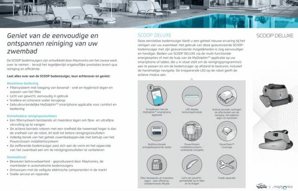Het is een modern en ergonomisch model bodemzuiger, het topmodel uit de Scoop serie. Deze robot heeft 1 motor en doet een cyclus van max. 2,5u.