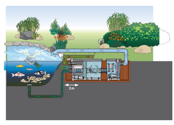 Dit complete vijverfilter is geschikt voor een gravitaire opstelling. Dit betekent dat je het grootste deel onder waterniveau kunt plaatsen. Dit maakt het systeem energiezuiniger en via een bodemdrain wordt het vuil op de bodem beter aangepakt. Het trommelfilter met bewegend bed plaats je bovendien makkelijker uit het zicht, doordat het slechts 10,5 cm boven het water uitkomt.